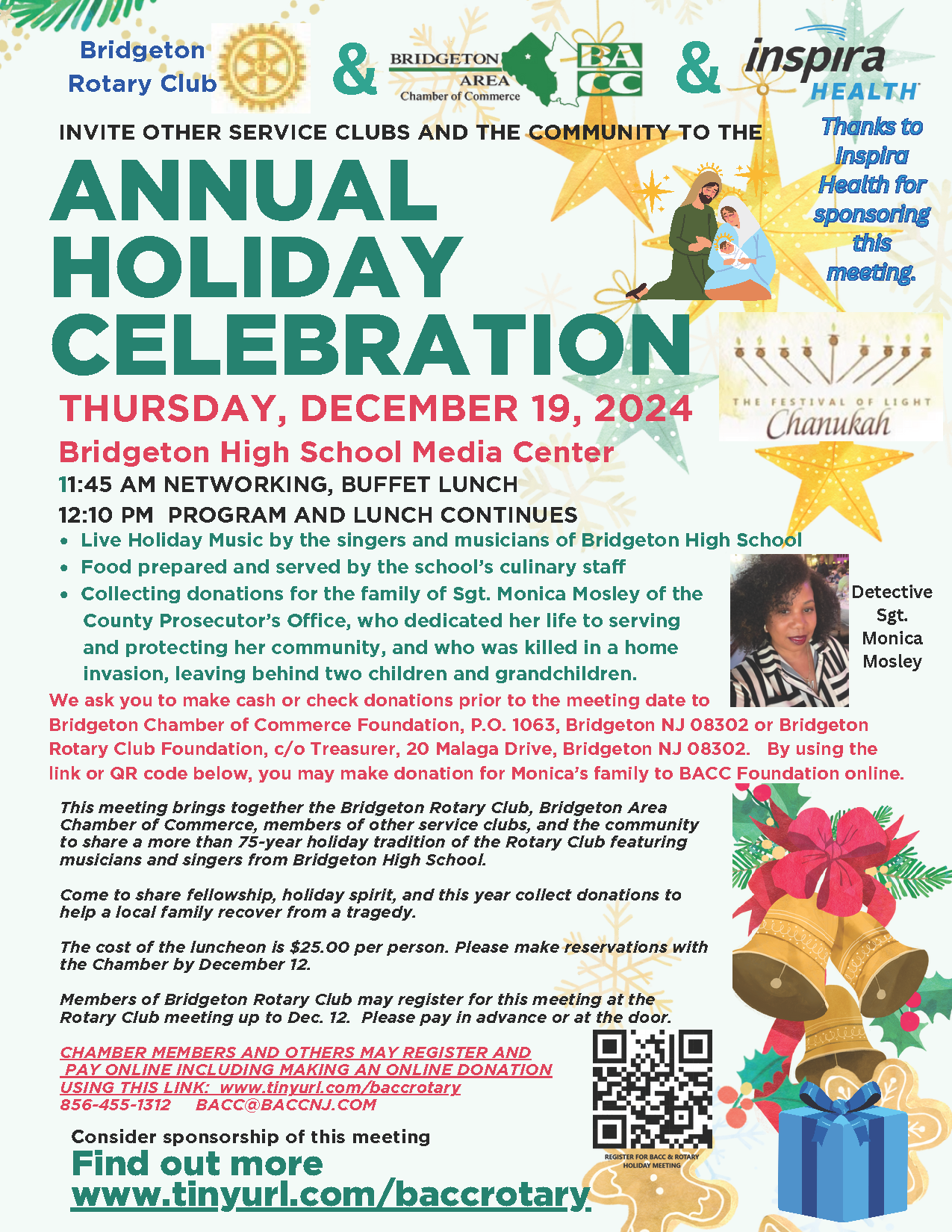 Bridgeton Rotary Club, Bridgeton Area Chamber, other service clubs, and the community join together for food, fellowship, Bridgeton High School student holiday musical performances, and we are accepting donations to support the Mosley family, after a tragic murder of their loved one who worked for the County Prosecutor's office.