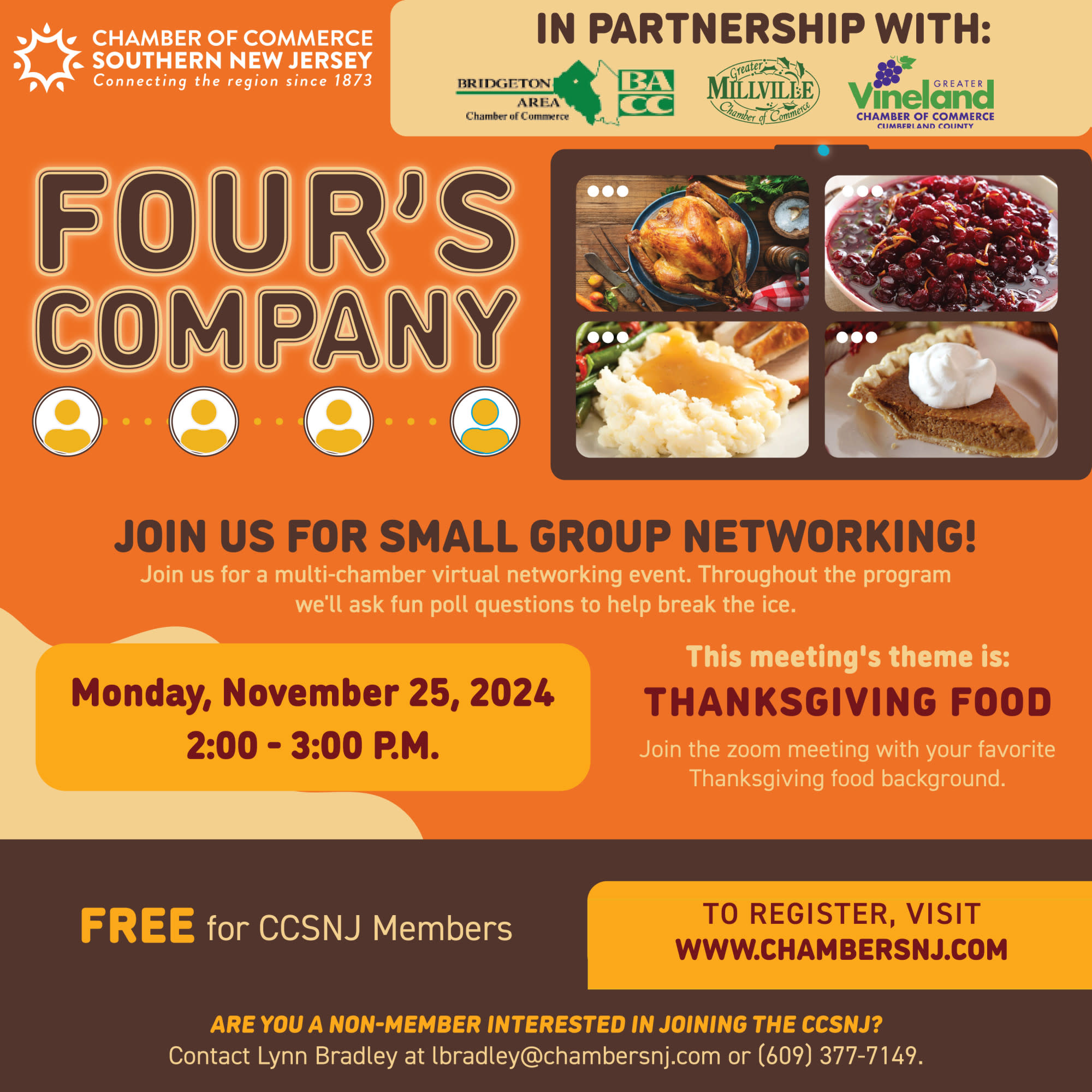 Bridgeton Area, Greater Millville, and Greater Vineland Chambers of Commerce join with The Chamber of Commerce of Southern NJ on Zoom for an hour of virtual networking on November 25, 2 PM.