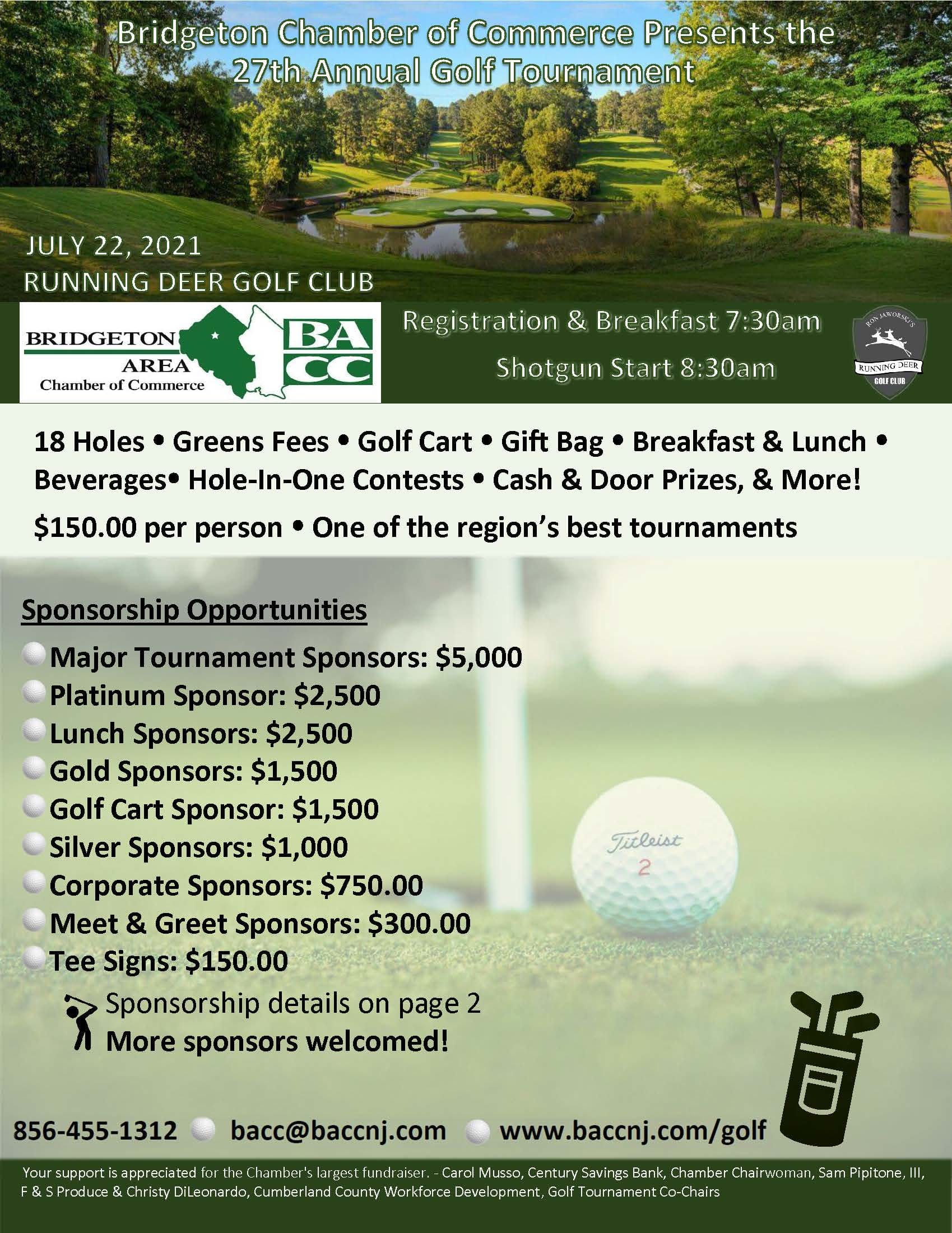 18 Holes Greens Fees Golf Cart Gift Bag Breakfast & Lunch Beverages Hole-In-One Contests Cash & Door Prizes, & More! $150.00 per person One of the region’s best tournaments!