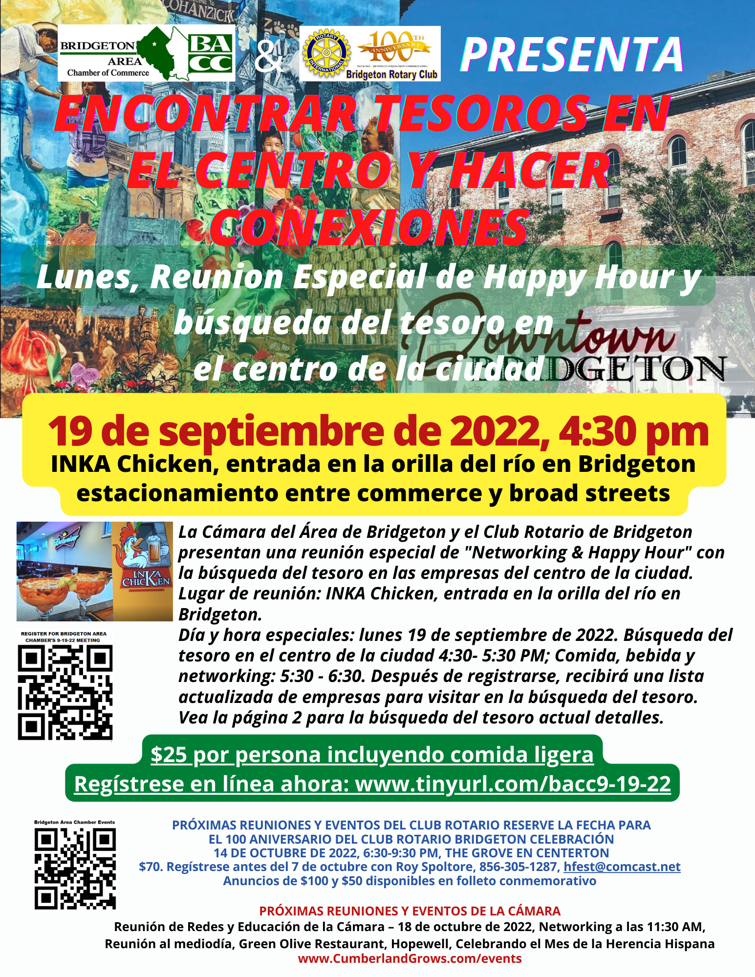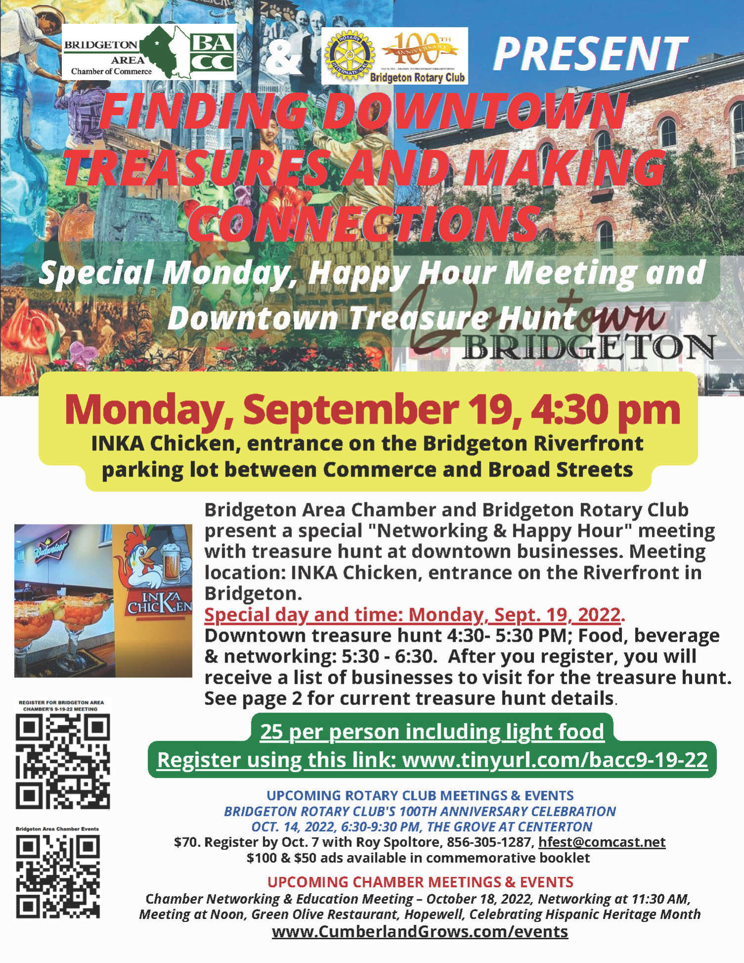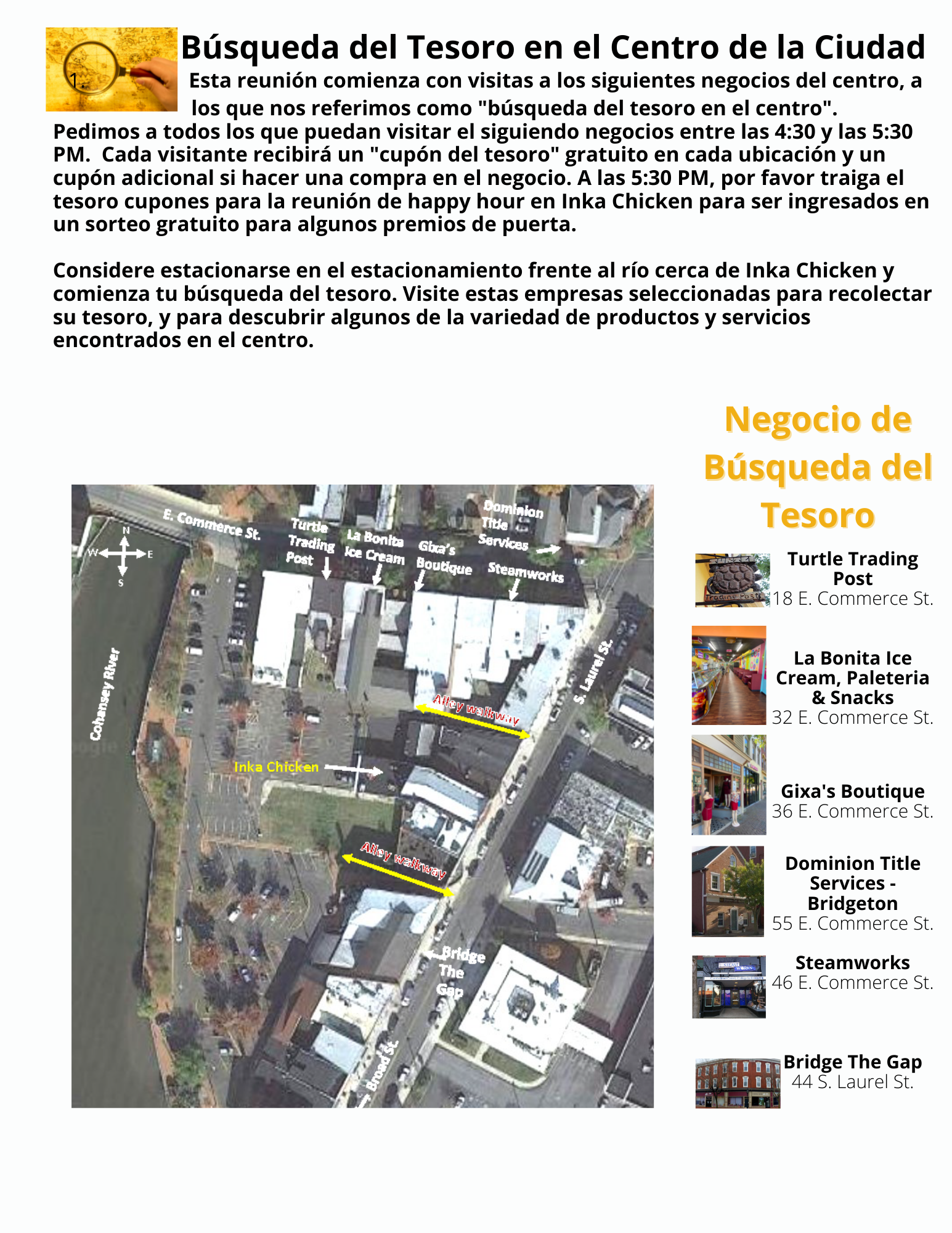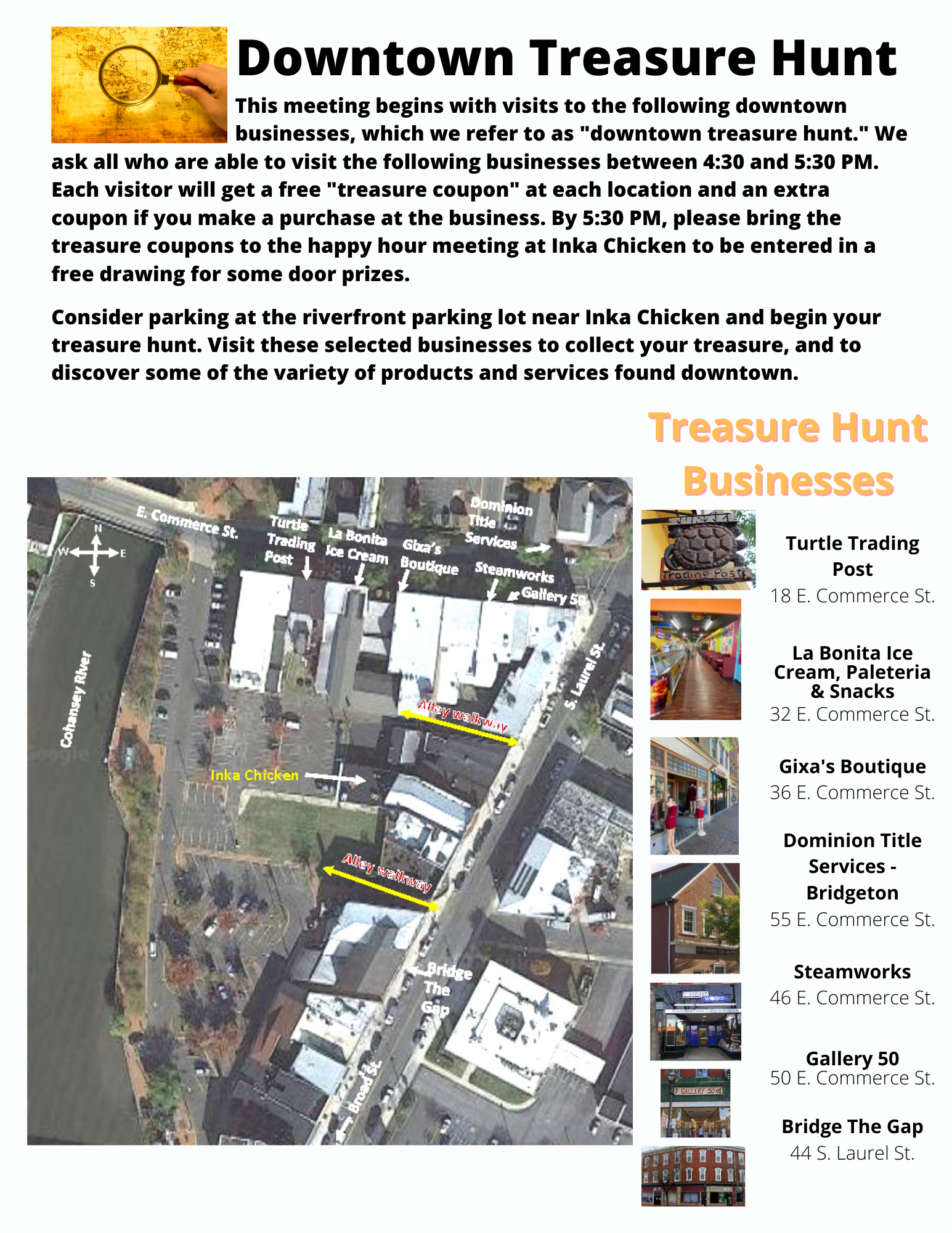 Business Treasure Hunt: 4:30 to 5:30 pm. Visit a list of designated businesses downtown, collect treasure coupons and bring them to the happy hour, networking meeting at INKA Chicken for prize drawings, food & beverages: 5:30 - 6:30 pm.