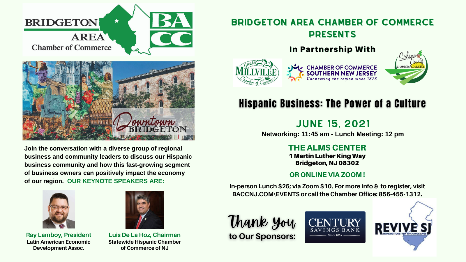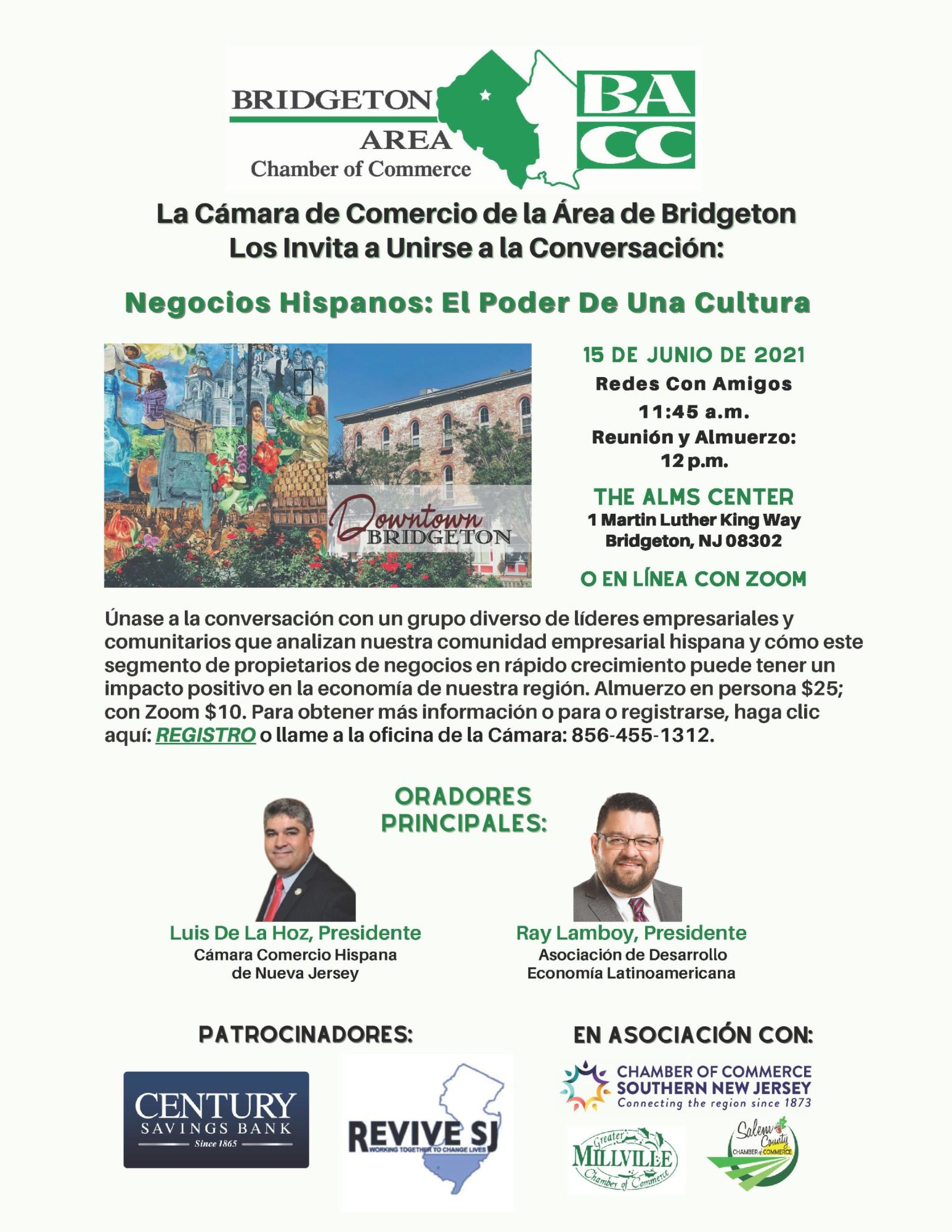 Join the conversation with a diverse group of business and community leaders discussing our Hispanic business community and how this fast-growing segment of business owners can positively impact the economy of our region. Our featured speakers are Luis O. De La Hoz, Chairman of the Statewide Hispanic Chamber of Commerce of New Jersey (“SHCCNJ”), and Raymond Lamboy of the Latin American Economic Development Assoc. (LAEDA).